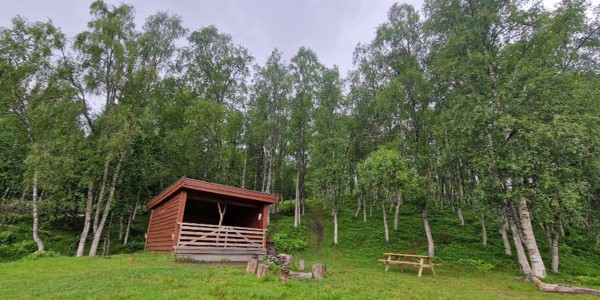 Vi har vår egen gapahuk i skogkanten, Trollgapet, som vi ofte legger turen til.